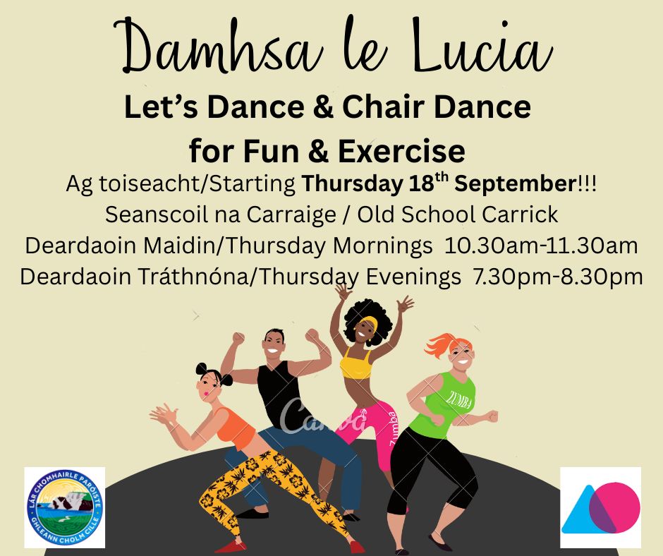 Let's Dance & Chair Dance with Lucia starting Thursday, 18th September in the Old School, Carrick. A mix of fun and gentle exercise, and suitable for all ages! Don't miss it![]()