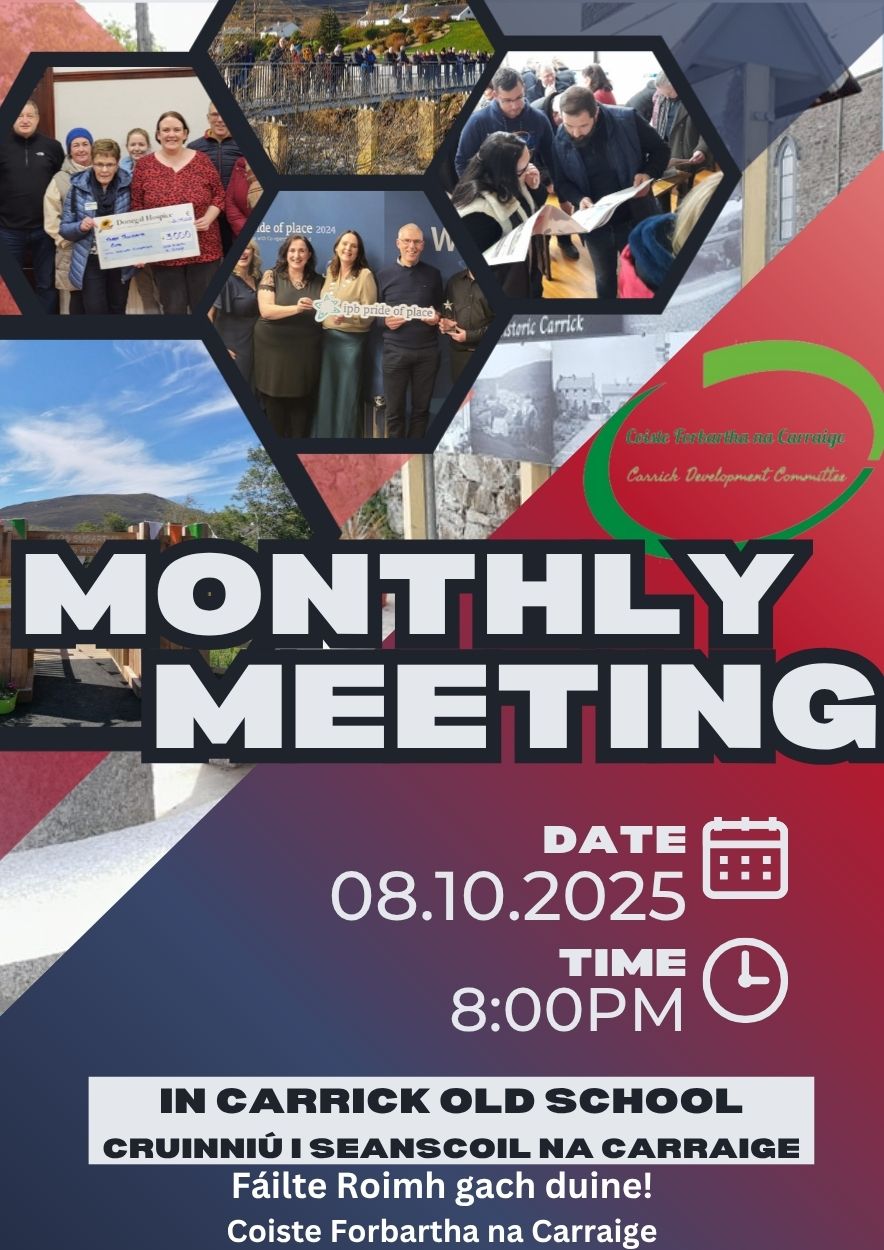 The Coiste Forbartha na Carraige Monthly Meeting takes place on Wednesday 8th October at 8pm in the Old School, Carrick - all welcome!