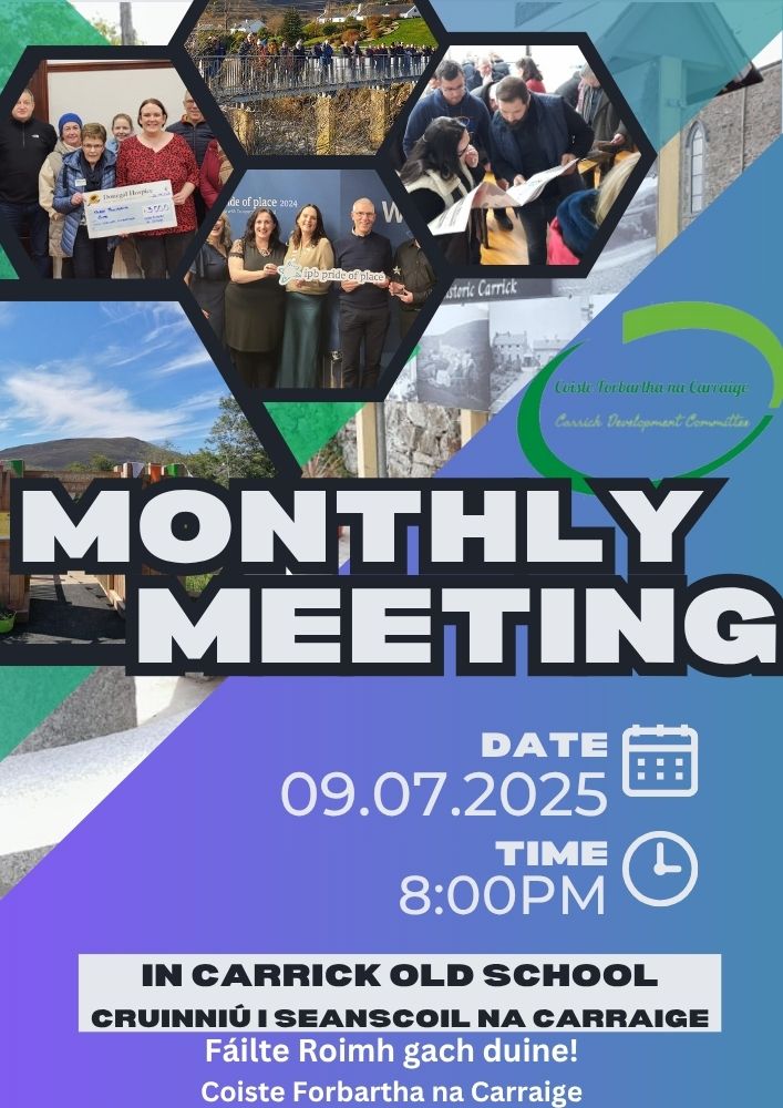 The Coiste Forbartha na Carraige Monthly Meeting takes place on Wednesday 9th July at 8pm in the Old School, Carrick - all welcome!