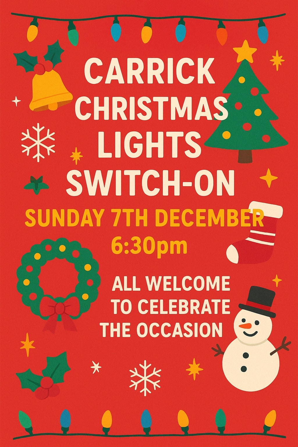 Carrick Post Office and Shop open Monday to Friday 9am-5:30pm (lunch 12:30 to 1:30), Saturday 9am-1:00pm