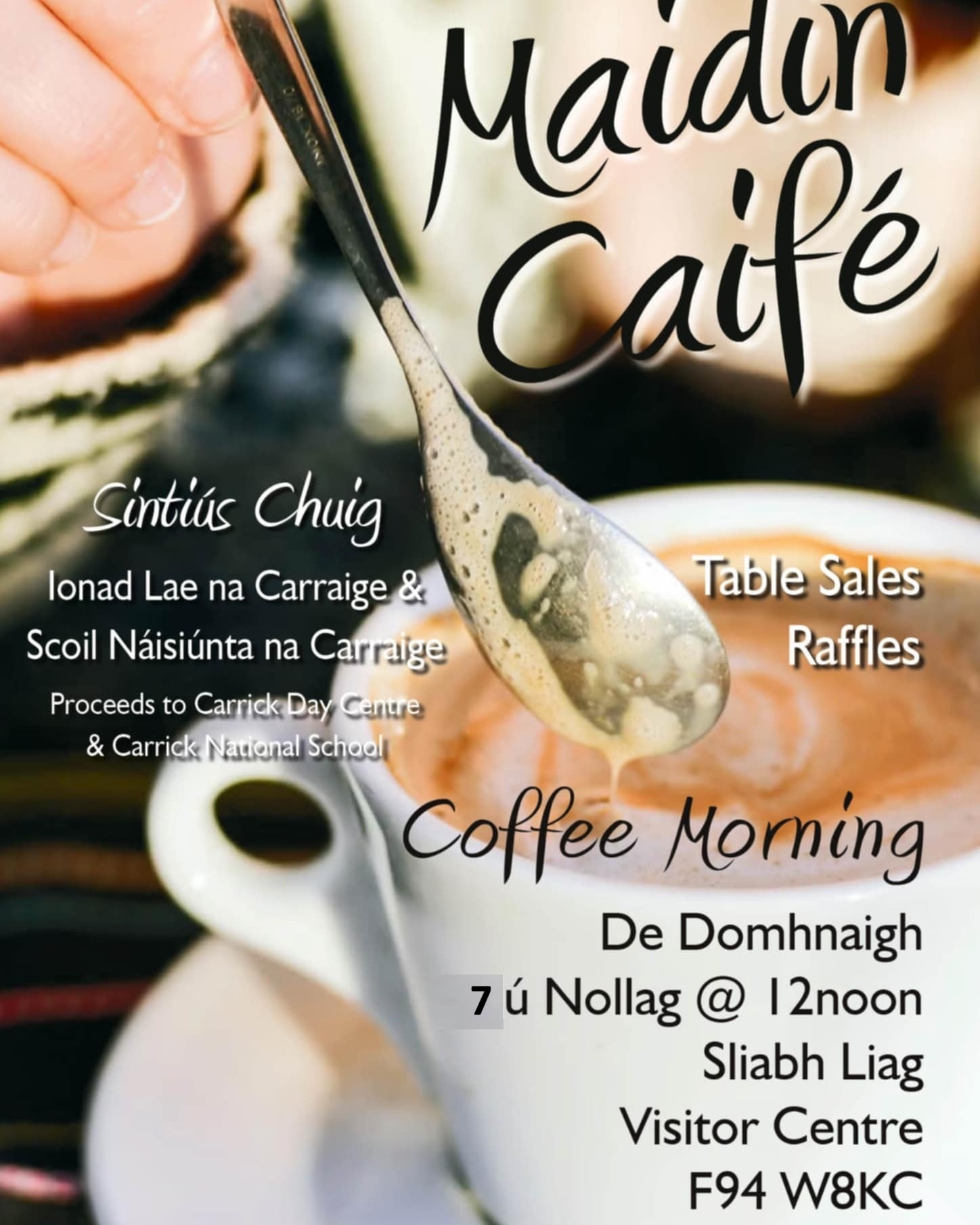Coffee morning in The Sliabh Liag Visitors Centre on Sunday 7th December at 12 noon, proceeds in aid of Carrick Day Care Centre and Carrick National School.