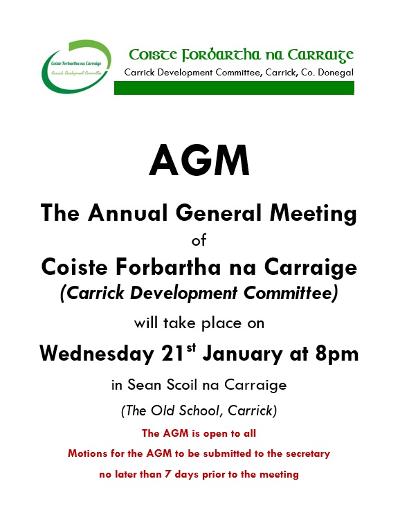 The AGM of Coiste Forbartha na Carraige will take place as follows: Venue: Old School, Carrick Date: Wednesday 21 January 2026 Time: 8:00 pm Motions: Motions must be with the...