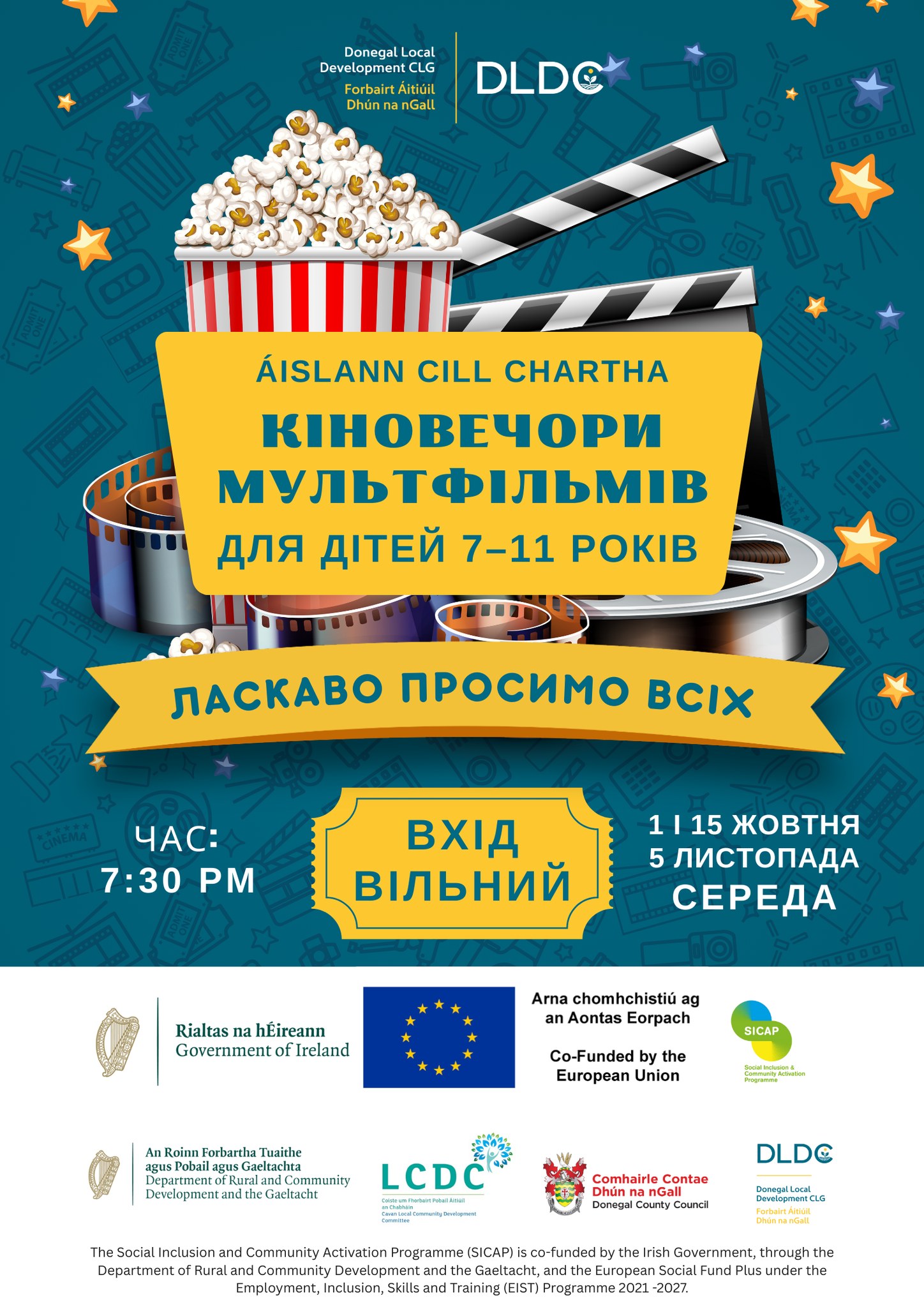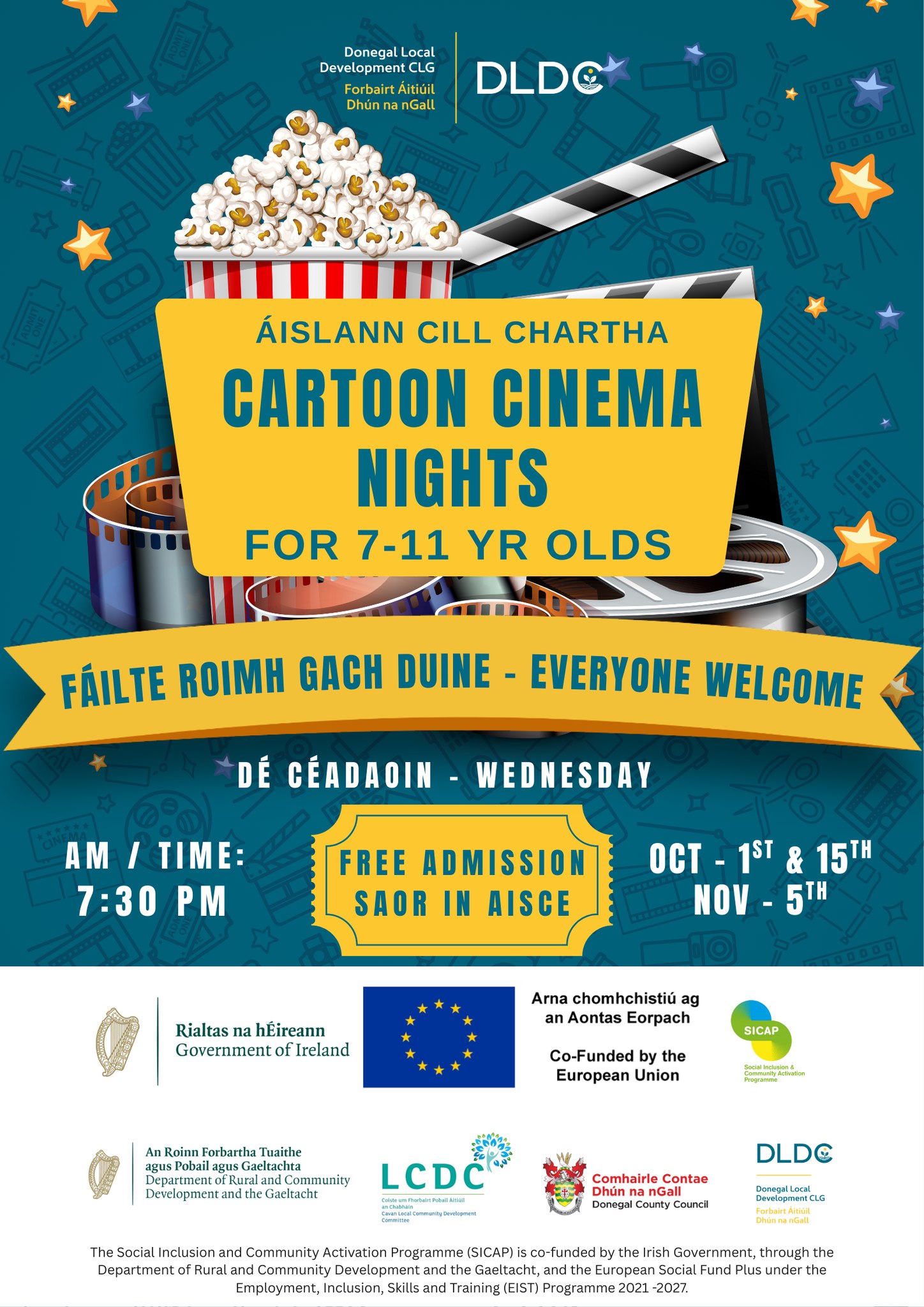 Cartoon Cinema Nights for 7-11 year olds in Áislann Chill Chartha on 1st and 15th October and 5th November