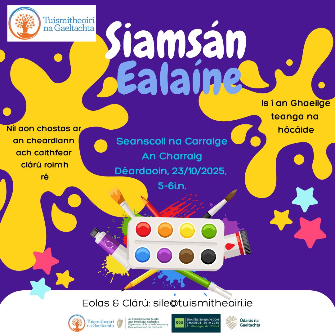 SIAMSÁN EALAÍNE, eagraí ag Tuismitheoirí na Gaeltachta. An Déardaoin, 23/10/25, i Seanscoil na Carraige. Níl aon chostas i gceist ach CAITHFEAR CLÁRÚ ROIMH RÉ le