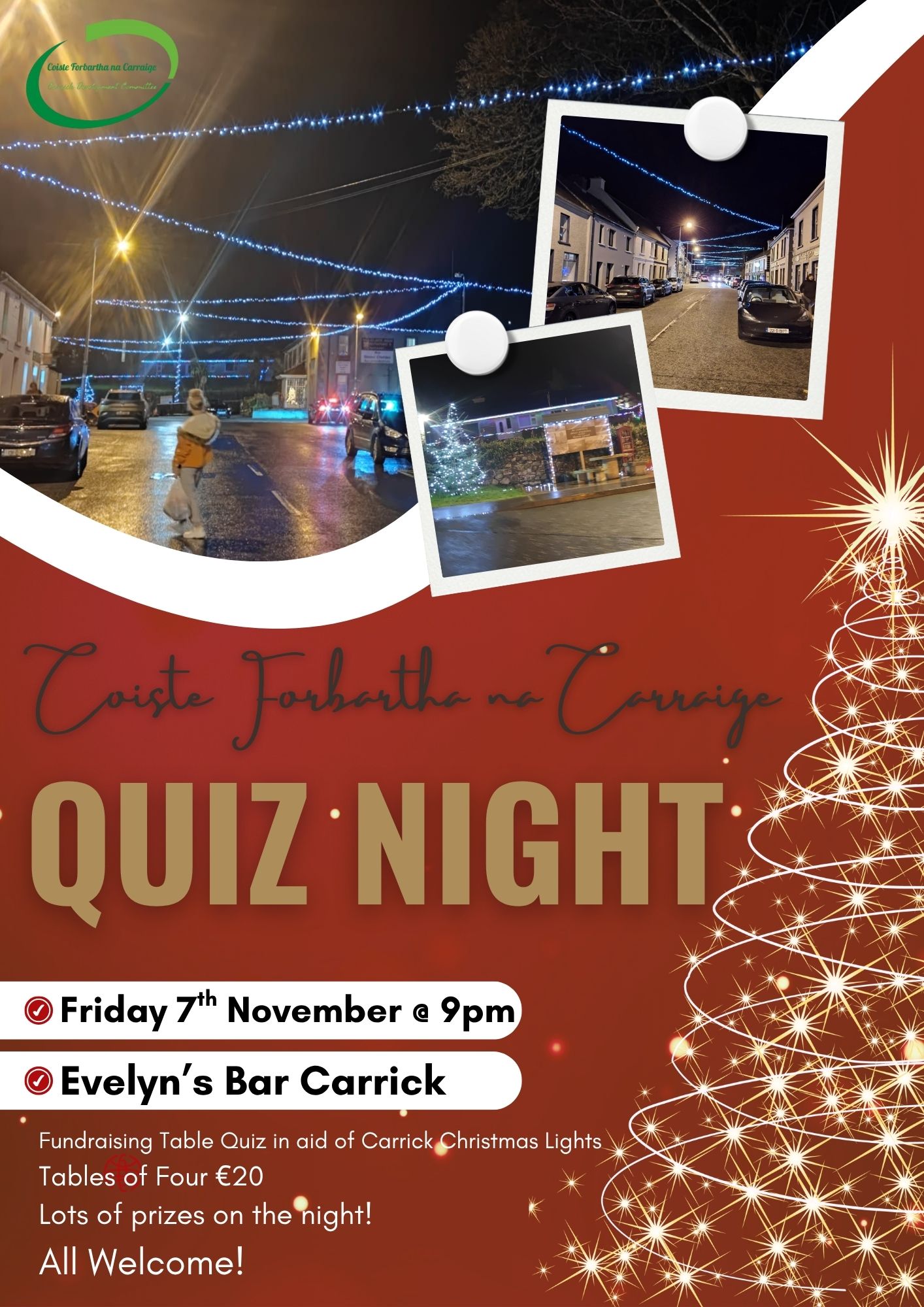 Due to some sets of Christmas lights being damaged last winter we need to replace them and we would also like to add some more to the village area so to help with this we are running a Fundraising Table Quiz in Evelyn’s on Friday November 7th at 9pm.