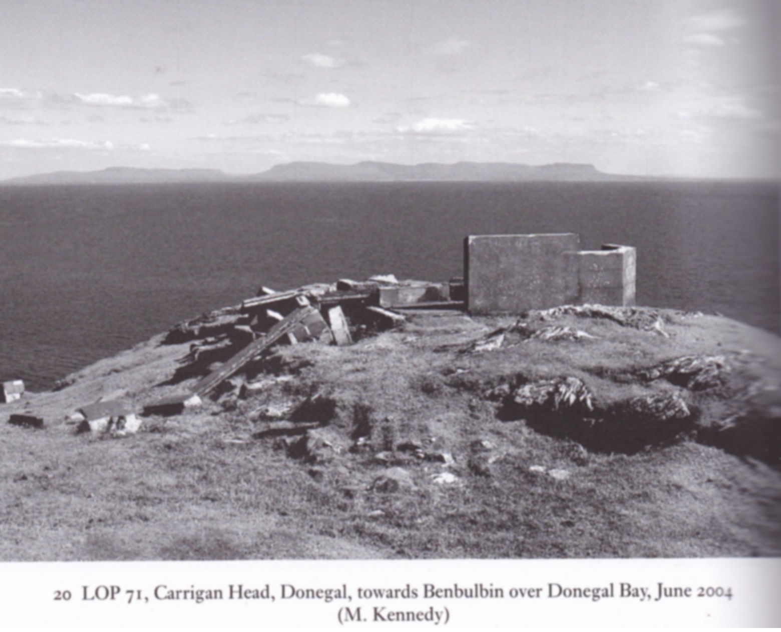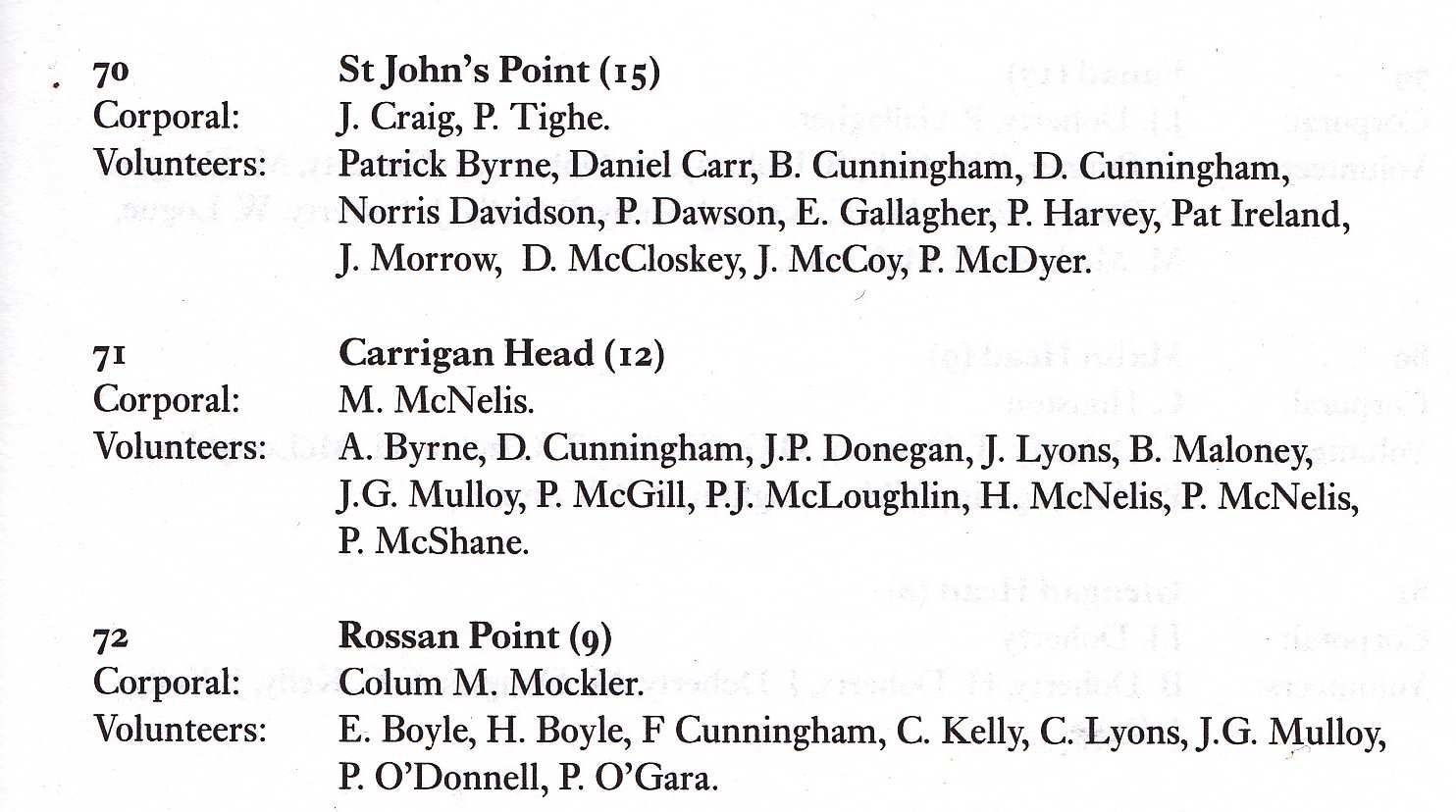 Notes: The late Anthony McNelis told me that Paddy O'Donnell from Dungloe served on Carrigan Head. Paddy O'Donnell's son, Seán, confirms that. I note that a P. O'Donnell served at LOP 72 Rossan Point, Malinmore. I have not identified the D. Cunningham listed above—he may be the D. Cunningham listed on LOP 70, St. John's Point. When there was a man short at one Look Out Post, a member was taken from an adjacent LOP to make up a Crew.
