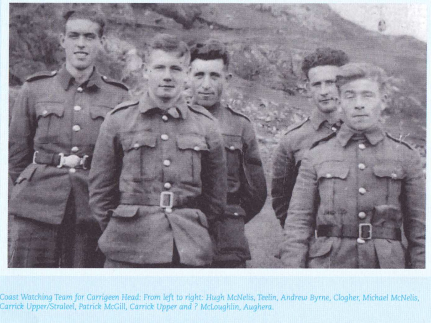 The names of the Coast-watchers who served at LOP 71 Carrigan Head were : Corporal Michael (Hill) McNelis. Volunteers: Andy Byrne; D. Cunningham; Jimmie P. Donegan; Jimmy Lyons; Barney Maloney; James G. Mulloy; Paddy McGill; Paddy J. McLoughlin; Hugh McNelis; Paddy (Shisealla) McNelis; Paddy (Beag) McShane. I found the names in p. 325 : Guarding Neutral Ireland 2008 by Dr. Michael Kennedy.