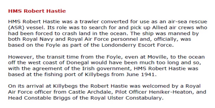 The ‘nod and a wink’ policy of ‘neutral Ireland’ extended to more than just a shortcut to the Atlantic. Other concessions followed. The establishment in June 1941 of an armed air/sea rescue trawler, the Robert Hastie, manned by eleven British personnel, at Killybegs, Co. Donegal, was shrouded in secrecy. Its purpose was to provide assistance to shipping casualties and to supply planes that had run out of fuel. The need for such a vessel was illustrated the previous April when Pilot Officer Denis Briggs, returning from a routine U-boat patrol, was forced to ditch his Saro Lerwick sea-plane in the sea off Tullan Strand, near Bundoran, when he ran out of fuel. Watching the descent of the stricken plane, Irish army observation posts shortly afterwards beheld the unusual sight of an airplane being towed to Bundoran by a passing fishing-boat and immediately reported the incident to HQ. This was a new dilemma for all involved. Local units of the Irish Army, unaware of decisions made at a higher level, proceeded on the assumption that the crew would be interned for the duration of the war and the plane impounded. Following some hasty consultation and diplomatic manoeuvring, a camouflaged airforce lorry arrived from across the border with 80 gallons of aviation fuel. The plane was made ready and took off with its crew for their home base on Lough Erne.