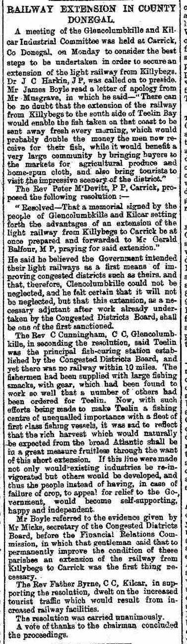 Of course the railway to Killybegs was built under the auspices of the Congested District Board. Many of the original minutes of meetings and decisions of the County Donegal Railways Joint Committee are held in The Public Records Office in Kew, London. Many years ago I visited the office and pulled out some of the minutes while researching the history of the railway. Thanks to Leo Solosy for the above and Peter Molloy for the newspaper article.