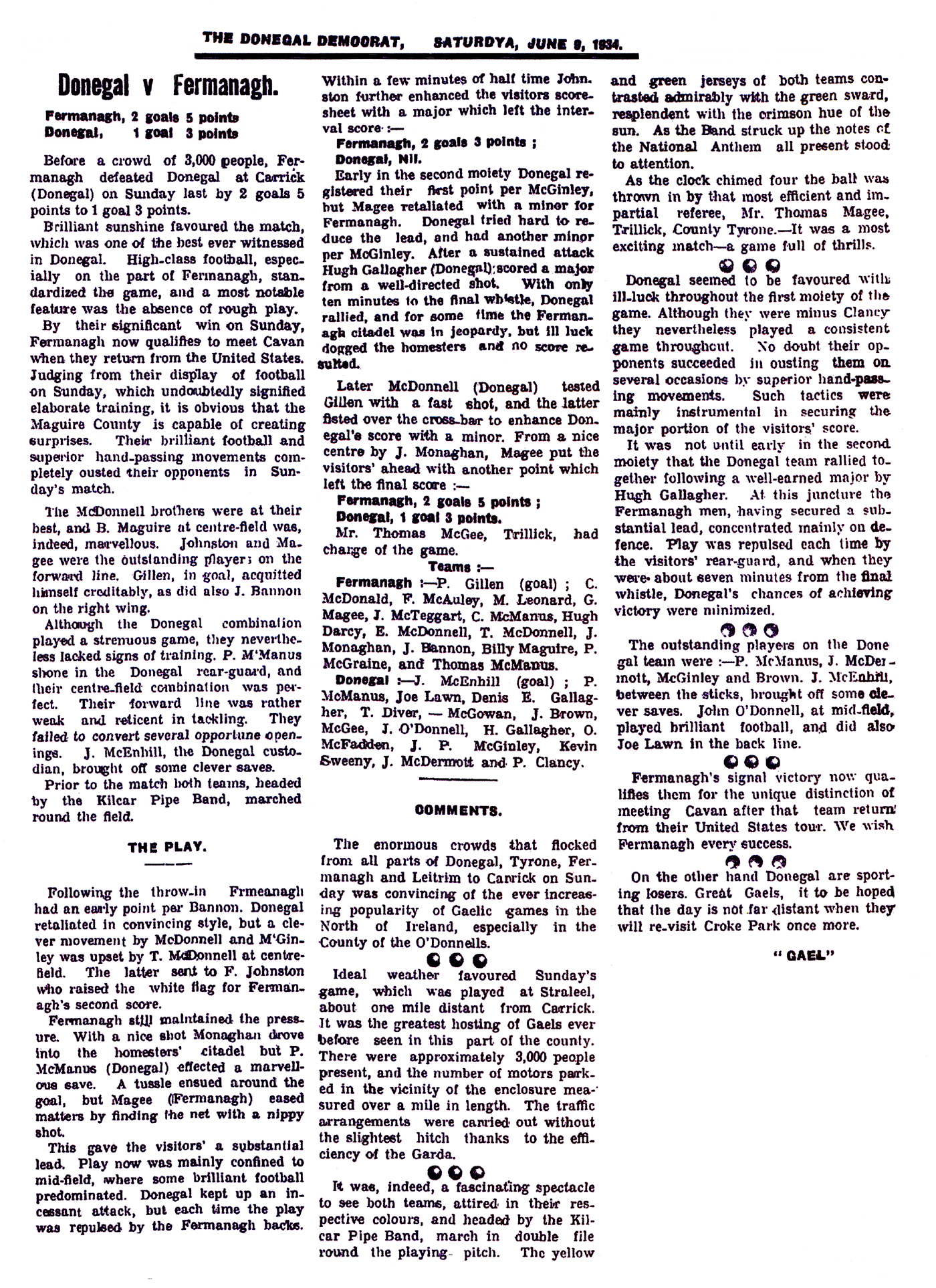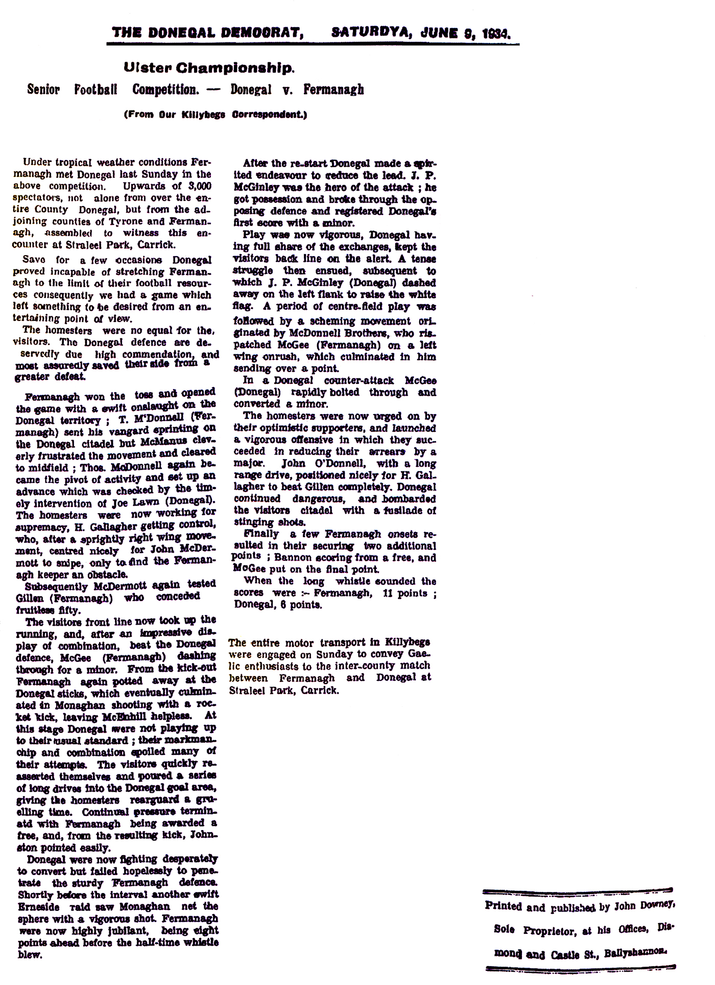On Sunday 3 June 1934 Straleel hosted an Ulster Senior Championship Quarter Final match where Fermanagh were the visitors, its reported over 3,000 attended with Fermanagh winning 2-05 to 1-03. John Brown from Carrick and JP McGinley from Uminskin were on the team that day. If anyone has any other information or photos from this match can they pass them on?