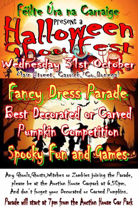 Feilte Ura na Carraige Halloween Parade Wednesday 31 October after the National School disco which is on from 6 to 7pm in The Old School.