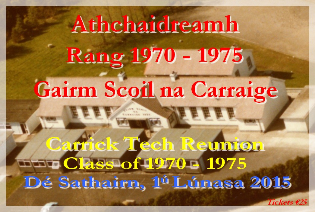 The Reunion or the students who enrolled in Carrick Vocational School in September 1970 or joined this class in the following years takes place this Saturday, 1st August, with a meal at 8.00pm in the Carrick Day Centre (the old Tech).