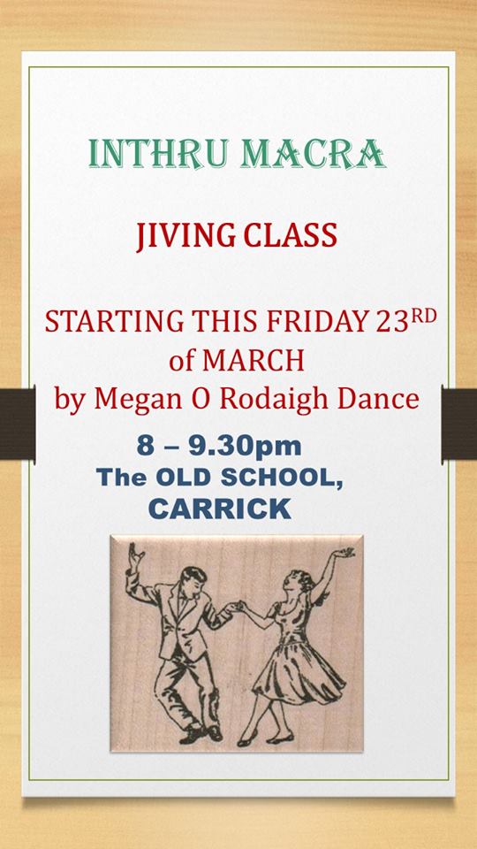 Inthru Macra are holding Jiving Classes starting this Friday 23 March from 8-9:30pm in the Old School, Carrick.