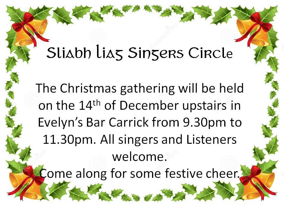 Sliabh Liag Singers Circle Christmas gathering on Friday 14 December upstairs in Evelyn's from 9:30-11:30pm, all welcome!