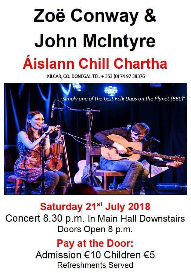 Zoe Conway and John McIntire make a return to Áislann Chill Chartha this Saturday night 21 July at 8:30pm doors open at 8pm a show not to be missed.