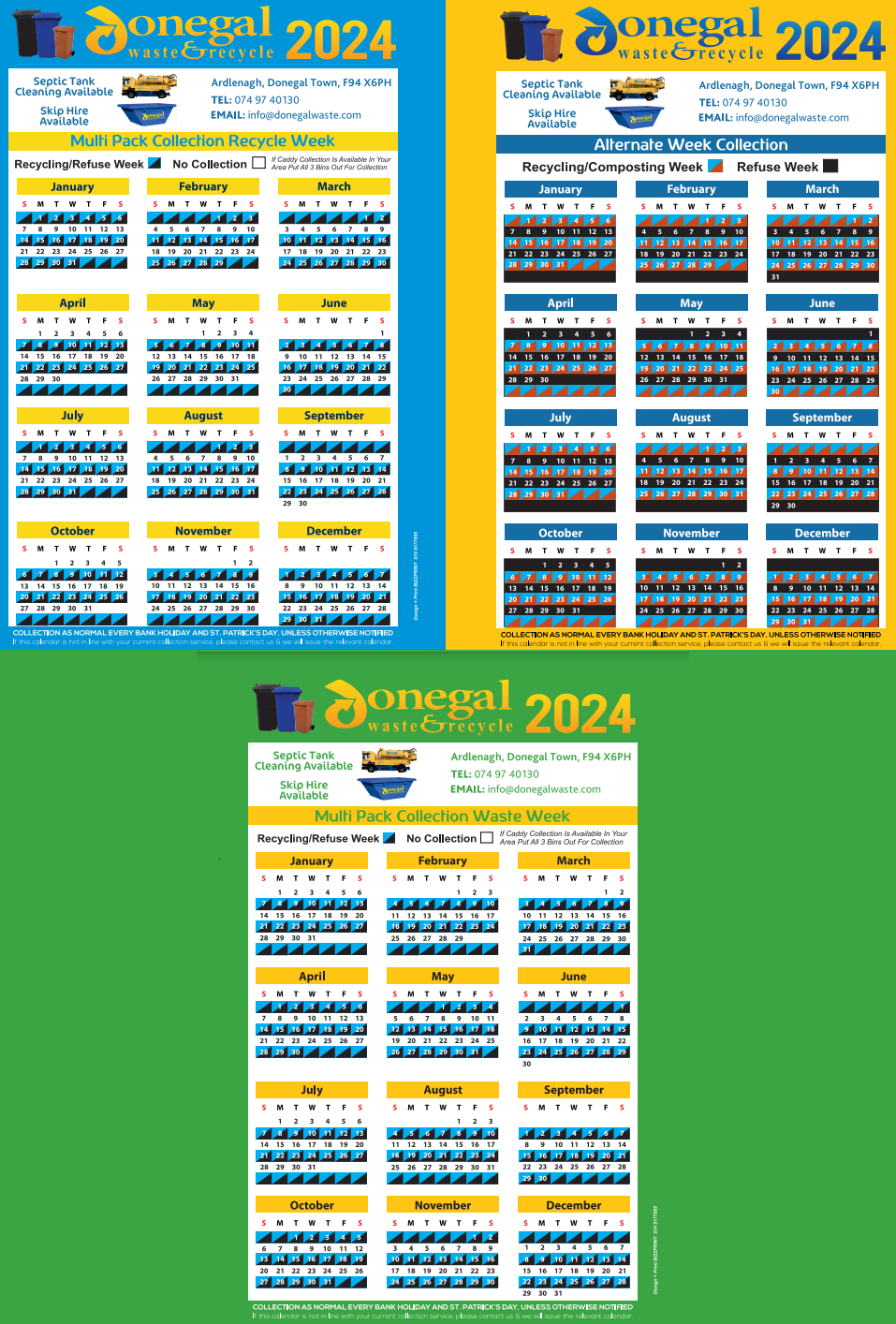 Donegal Waste and Recycle every Wednesday Morning see timetable above for details on which service is one each week or if you need further information visit their website HERE